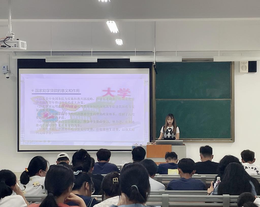 稍后,杨楠从定义、意义、作用、还款方式和注意事项五个方面讲解了助学贷款的政策知识,她以生活中的真实事件告诫学生要远离“校园贷”,并告诉学生远离校园贷的做法;最后,杨楠向学生发出恪守诚信、理性消费的倡议,呼吁学生用实际行动书写良好的个人信用记录。