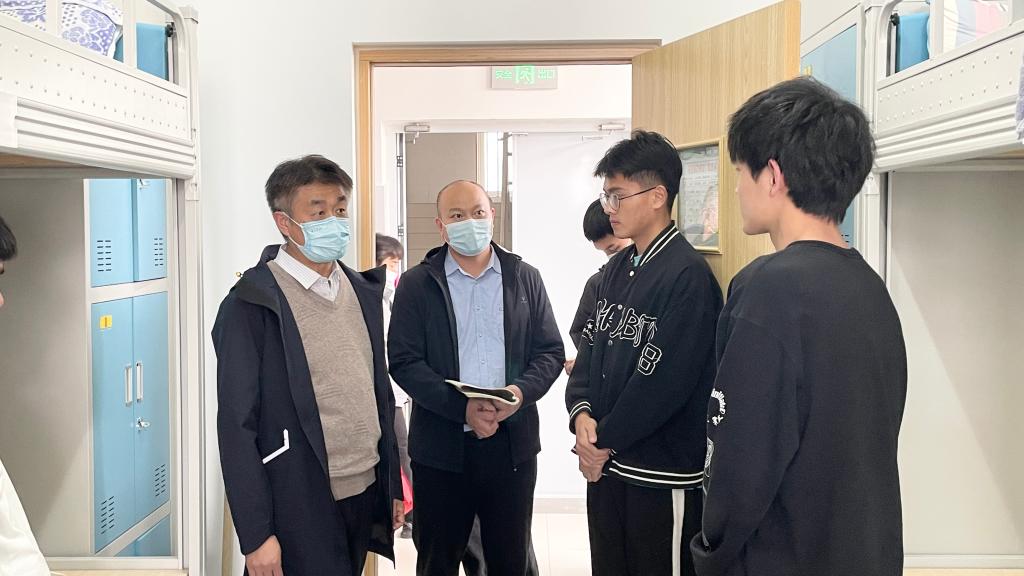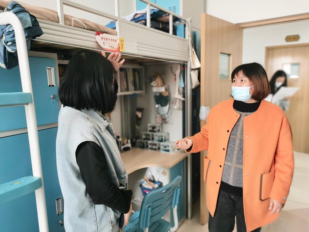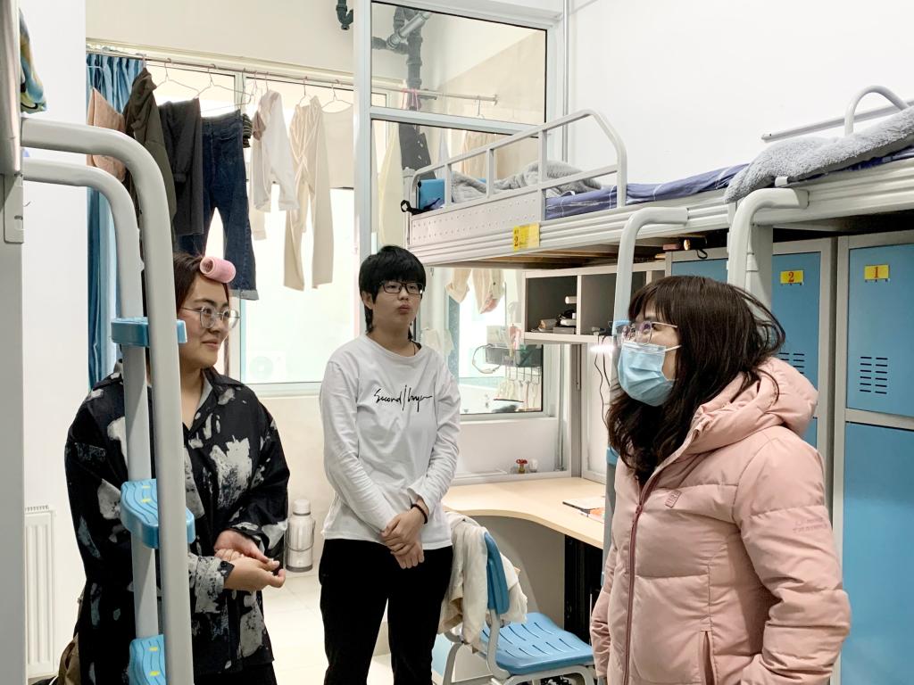 走访中,学院领导和辅导员老师们与同学们进行亲切的交谈,亲切地询问同学们目前网上教学的适应情况,关心同学们的饮食起居,同时还叮嘱同学们在生活和学习上遇到困惑与难题要及时与辅导员联系。刘振宇提醒同学们,当前处于疫情防控的关键时期,大家要做好个人安全防护,加强体育锻炼、提高身体素质,每天按时进行宿舍消杀。同时也请转告家长,目前校党委书记驻扎新校区指挥作战,全校上下一心,物资供应充足,生活便利有序,我们绝对有信心有能力打赢这场疫情防控遭遇战,请家长们放心。这次宿舍走访也受到了同学们热烈欢迎,同学们纷纷表示老师的关心和鼓励让他们坚定了信心与决心,将坚决做到“防疫有我”,用心上好每一堂网课,用力践行疫情防控政策,用心感受枣院别样的春天。
